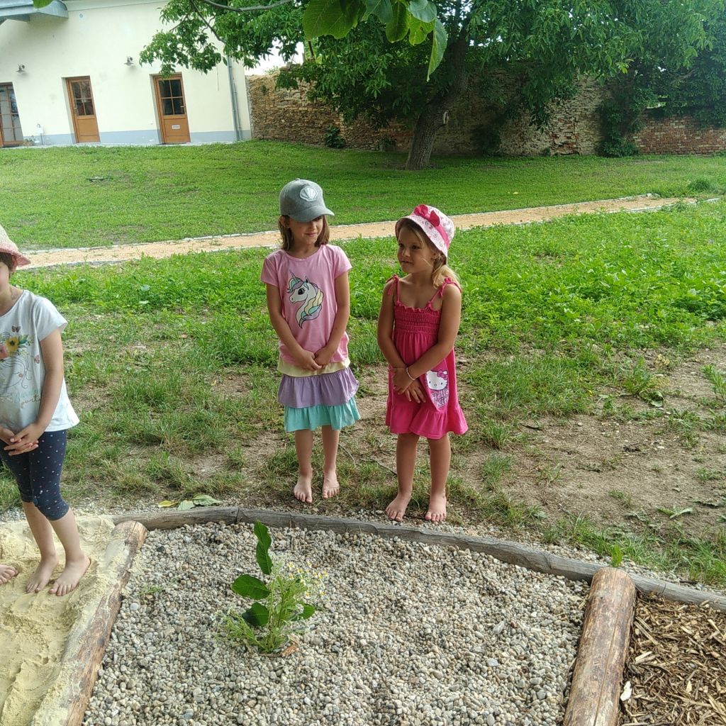 V druhé části našeho ekologického dopoledne jsme se bosky jako jedna velká "mašinka" přesunuli do dvora, kde na nás čekal nový smyslový chodník s různými materiály (jako je písek, kamínky, štěrk, štěpka, kulatiny, kameny či šišky). Ten jsme si nejen bosky prošli a promasírovali si tak plosky nohou, ale také děti ve dvojicích vytvořily překrásné mandaly, které takto kreativně pojmenovaly:
