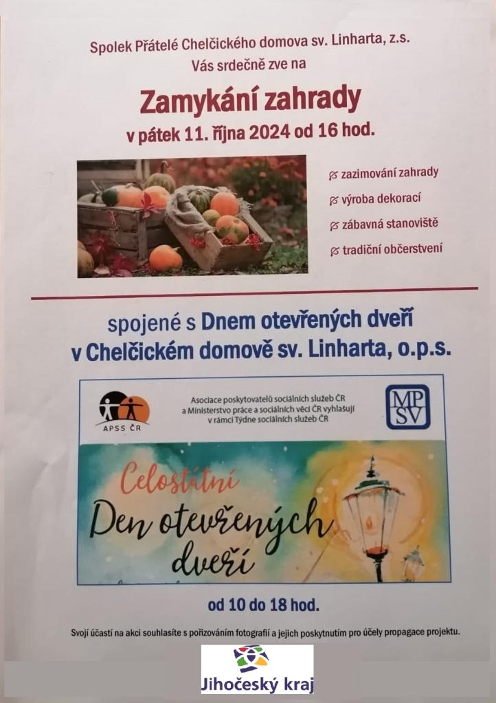 Zamykání zahrady je spojené s Dnem otevřených dveří v Chelčickém domově sv. Linharta v rámci Celostátních Dní otevřených dveří sociálních služeb.
